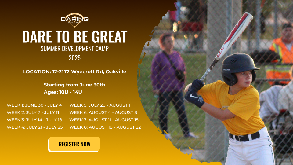 Elevate your baseball game this winter with the DARE TO BE GREAT Off Season Development Program—a comprehensive 16-week training experience designed for dedicated athletes. From November to March, participants engage in 32 high-intensity sessions (two 2-hour sessions per week) focused on developing strength, speed, power, and advanced baseball skills. We deliver elite coaching, structured progression, and a supportive environment to help your athlete reach the next level.